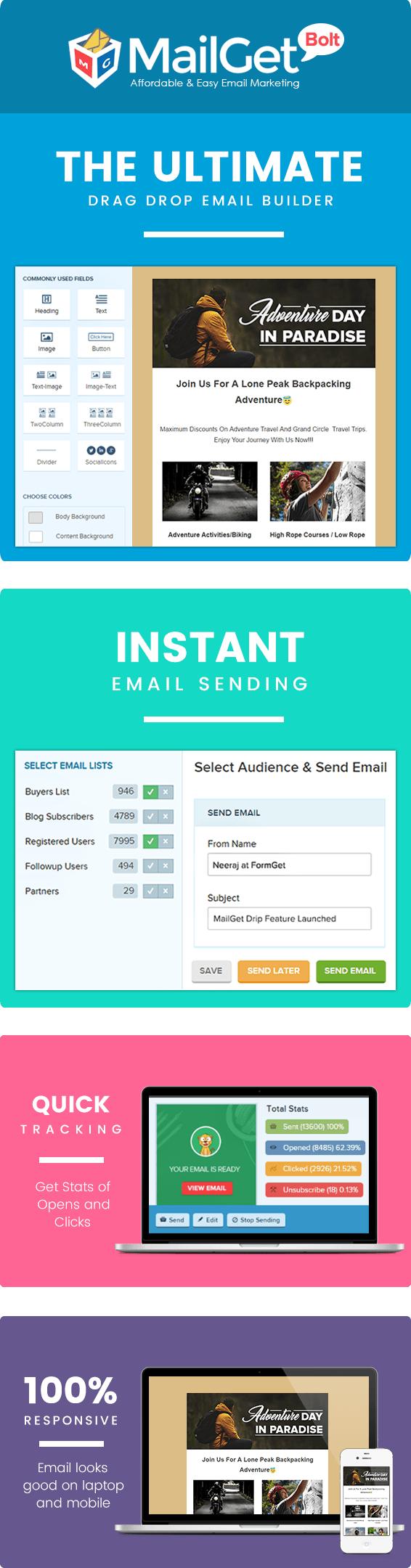 MailGet Bolt – email marketing software is one the best and responsive marketing technique which allows to send tons of emails, newsletters about adventurous holiday company to their current & future customers.