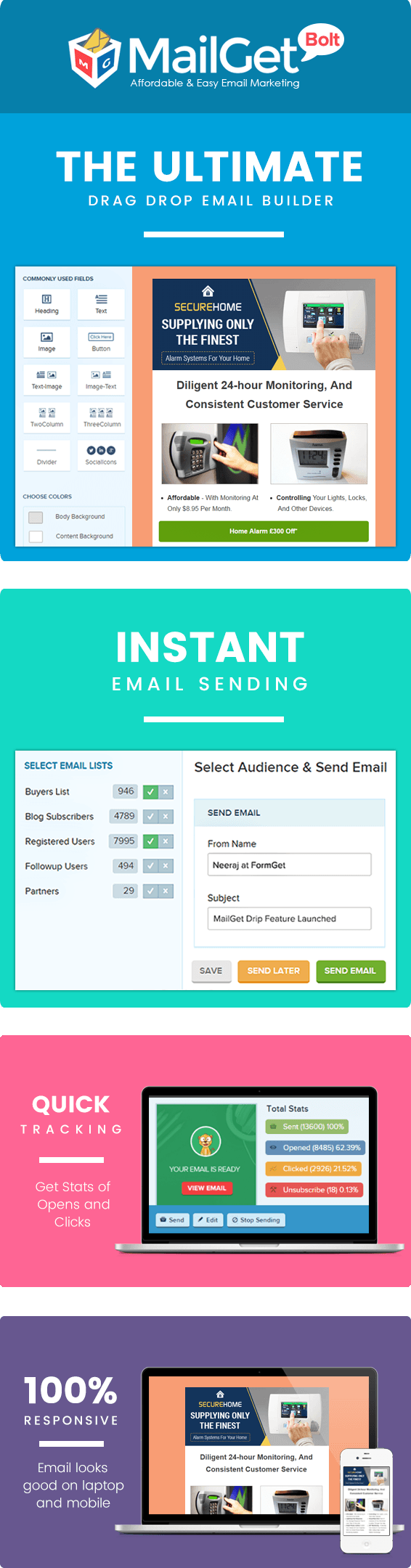 With this email marketing tool, you get multiple email building options using which you can create attention to grab emails and do the promotion of different alarm & security devices.