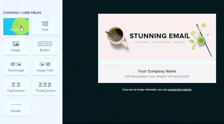 The builder enables you to effortlessly drag the required field (text, images, divider, button, etc.) and place it accordingly in the content area like this-