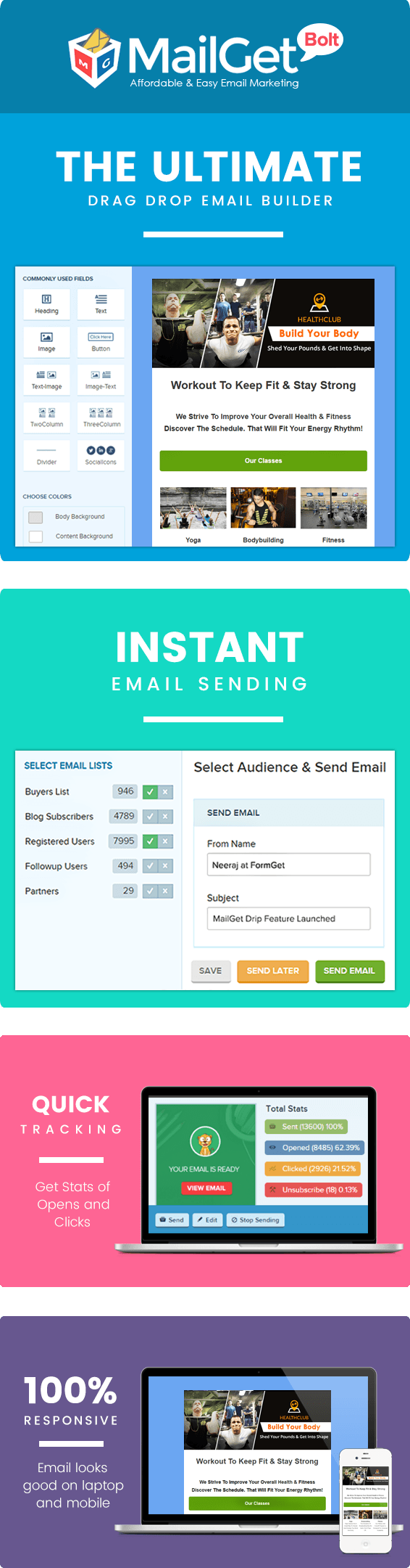 • Drag & Drop: – Construct eye-catchy emails in just a few minutes using this email. Select the desired text or media fields, feed the data content and start sending them immediately.