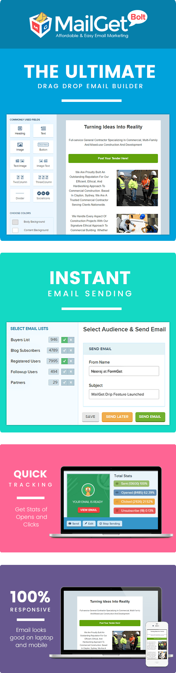 MailGet Bolt provides all the status of the sent emails on the dashboard panel in an organized manner. It display the number of how many emails were
