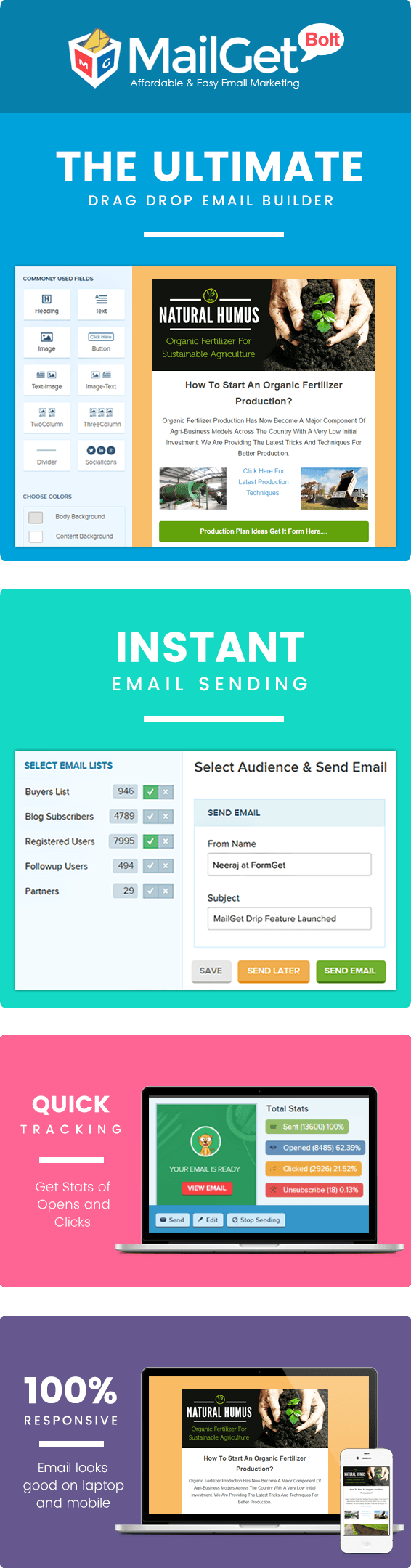 MailGet Bolt, rather than sending emails also enables you to check the status of organic fertilizers emails regarding opening rates, unopened emails, click rates and unsubscribed subscribers.