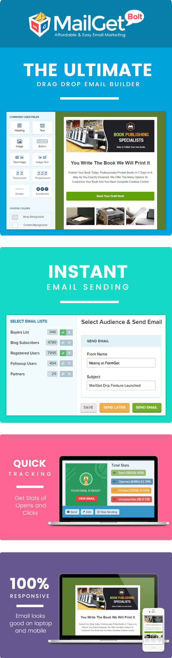 MailGet Bolt – a top and best email marketing service is responsive & cost effective with which you can send bulk emails for promoting the publishing company.