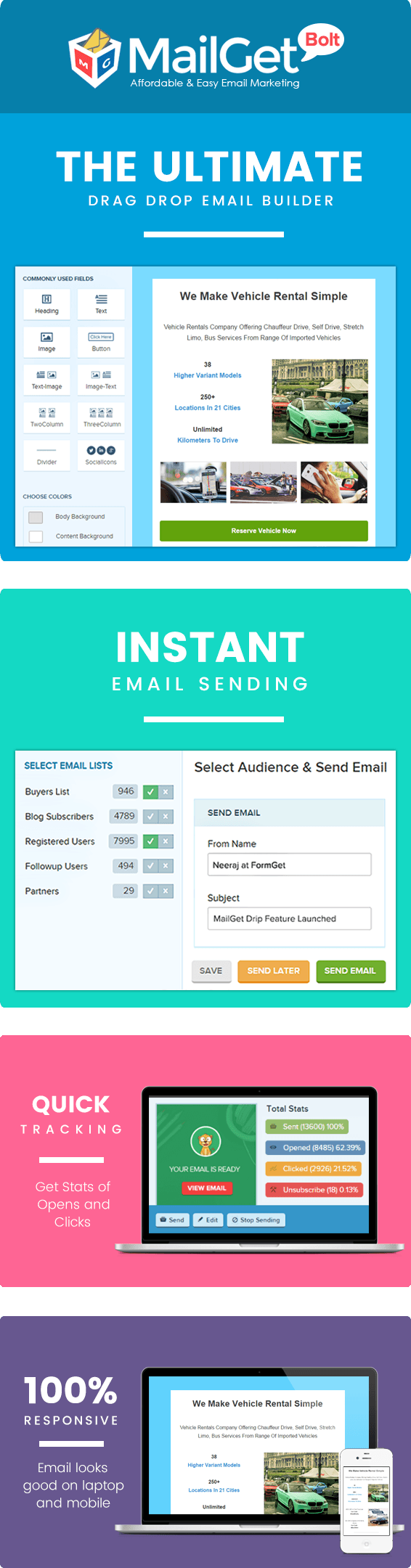 Drag & Drop Email Builder: Construct stunning email templates by using drag & drop email builder related to your automobile rental company add images, text, headings, button and link etc. and make your services popular.